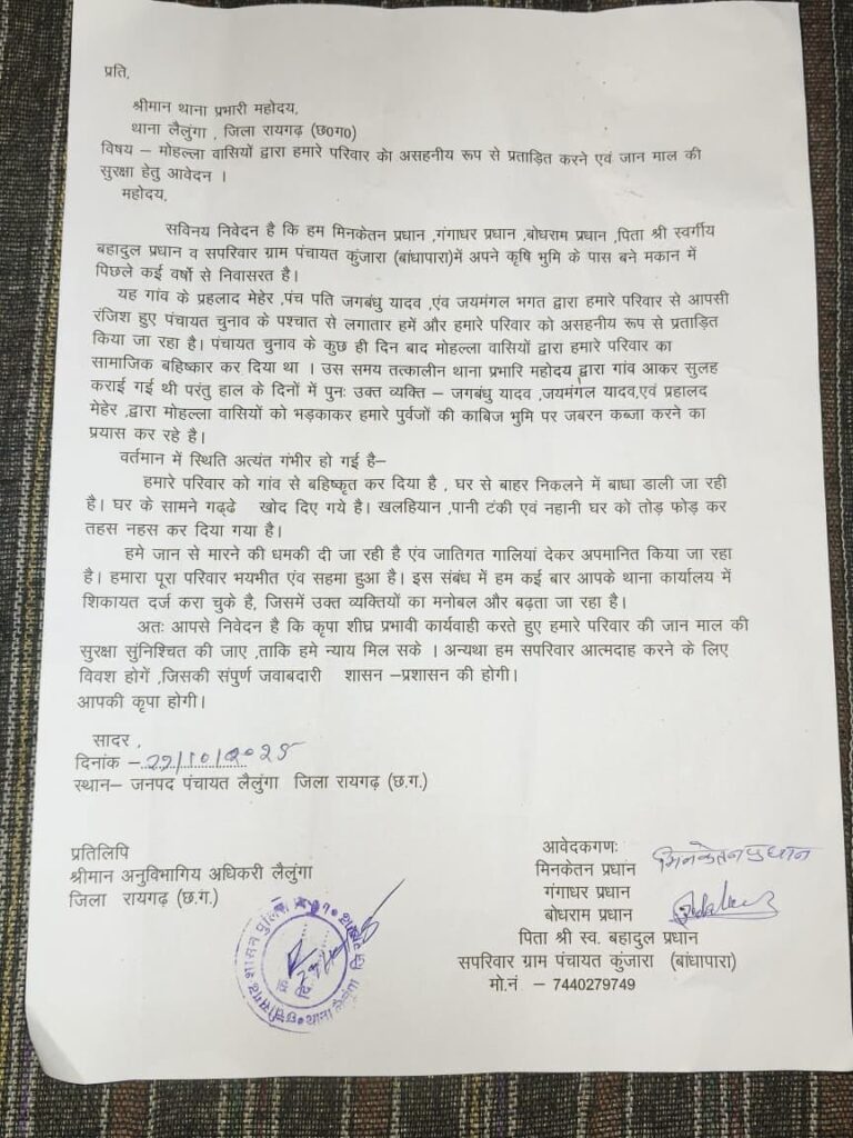 ग्राम पंचायत कुंजारा (बांधापारा) में इन दिनों माहौल तनावपूर्ण बना हुआ है। गांव के निवासी मिनकेतन प्रधान, गंगाधर प्रधान और बोधराम प्रधान (पिता स्व. बहादुल प्रधान) ने थाना लैलूंगा में एक गंभीर शिकायत दर्ज कराते हुए आरोप लगाया है कि गांव के उपसरपंच जयमंगल भगत, पंच पति जगबंधु यादव एवं प्रहलाद मेहर द्वारा उनके परिवार को पिछले कई महीनों से असहनीय रूप से प्रताड़ित किया जा रहा है।