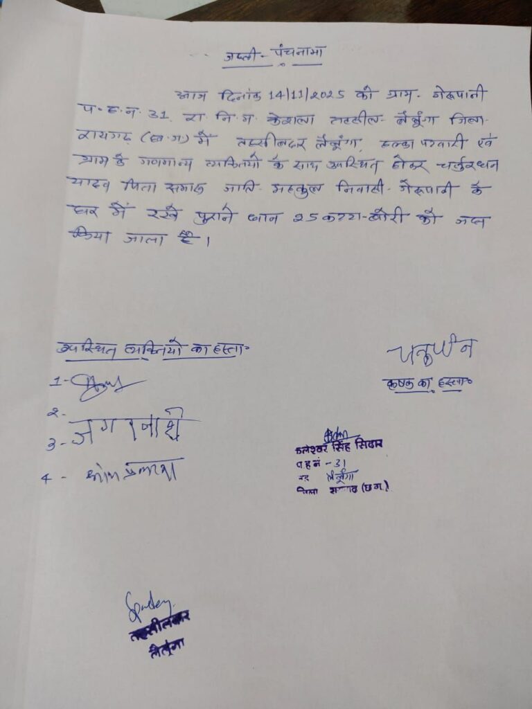 लैलूंगा/ग्राम गेरूपानी, प.ह.न. 31 राजस्व निरीक्षण मंडल केशला, तहसील लैलूंगा जिला रायगढ़ (छ.ग) में आज दिनांक 14/11/2025 की सुबह प्रशासनिक टीम ने ताबड़तोड़ कार्यवाही करते हुए अवैध रूप से रखे गए पुराने धान के जखीरे को पकड़ा। यह कार्यवाही इतनी तेज और दबंग तरीके से की गई कि पूरे क्षेत्र में देखते ही देखते बवाल जैसा माहौल बन गया।